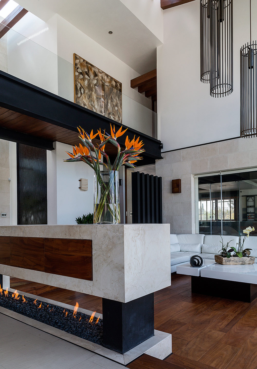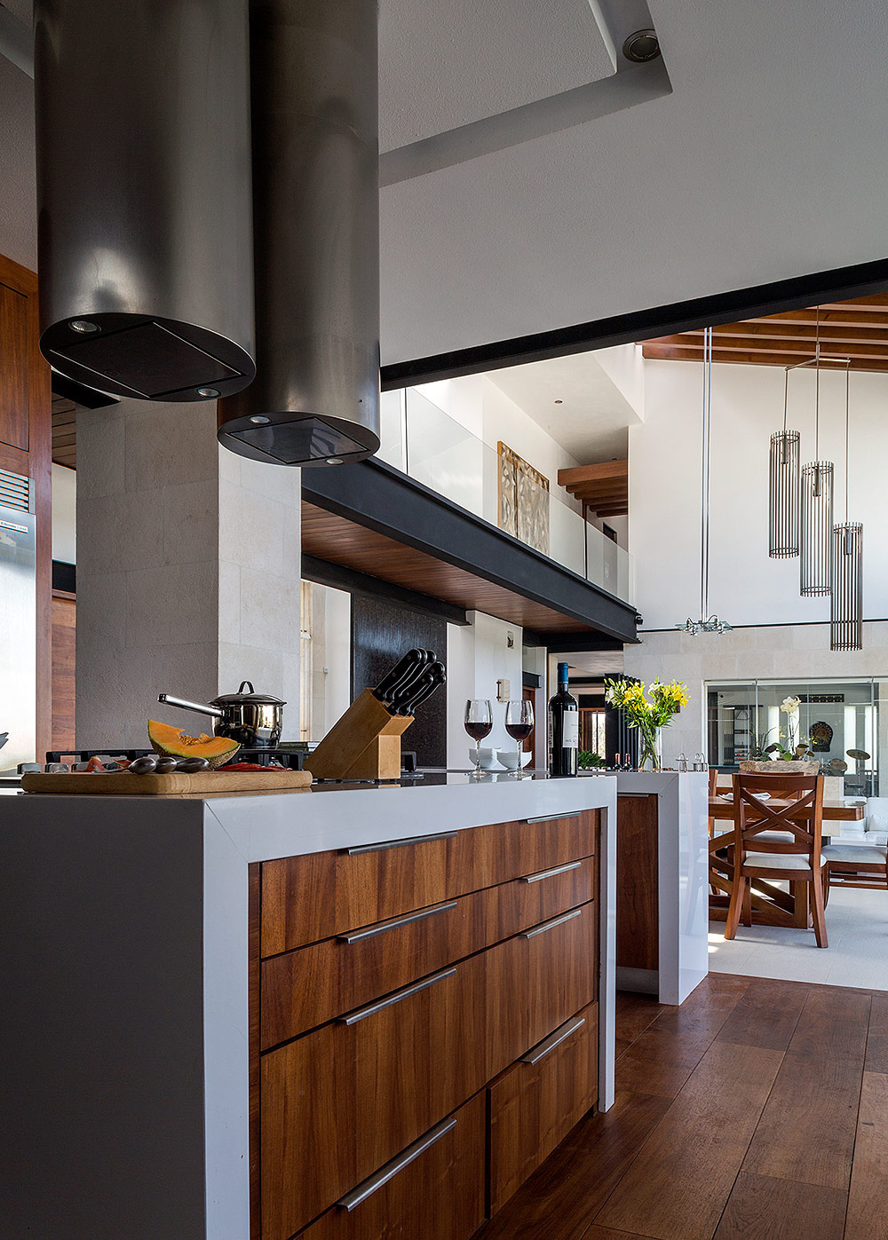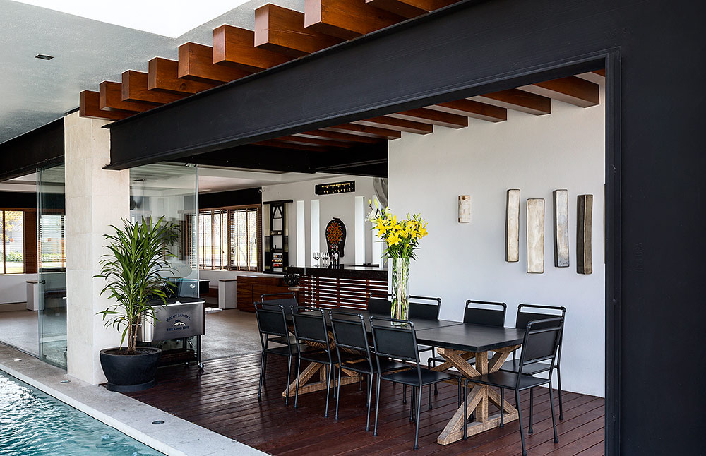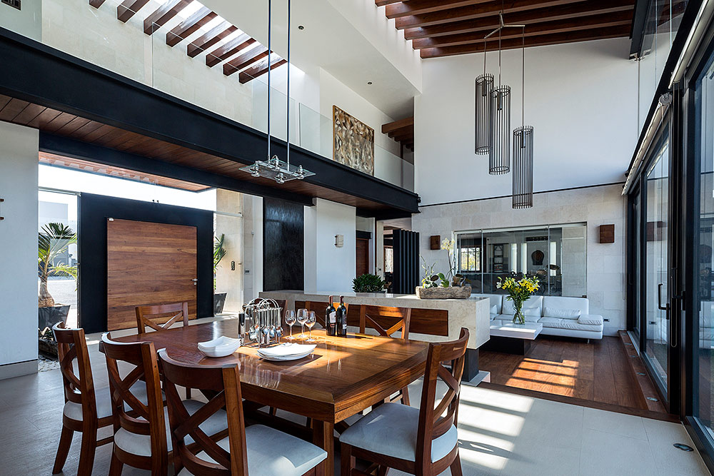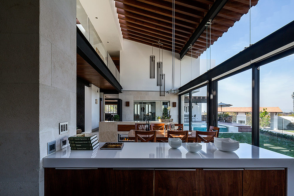 Situada dentro de un complejo residencial con campo de golf enQuerétaro, esta casa es un espléndido ejemplo de respeto por el entorno. Se localiza en un terreno elevado que privilegia vistas emocionantes al campo; de allí la transparencia como concepto unificador con el ambiente para crear una atmósfera general de bienestar y libertad. El diseño es atemporal y confortable, con una arquitectura simple y alejada de protagonismos, donde lo más importante fue integrar los materiales estructurales para crear escenarios complacientes. La personalidad de la mayoría de las áreas se define por los materiales utilizados en su construcción: estructura metálica en negro, cristal para integrar exteriores con interiores, muros en tono blanco —algunos recubiertos por piedra natural que más que resaltar se incorporan al entorno—, el mármol y algunos granitos que acentúan los acabados, además de madera de Tzalam que, por su abundancia, otorga equilibrio y brinda calidez a los interiores de la casa.